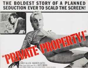 It’s ‘plausible’ – and I use the word carefully – that Ann Carlyle is unaware of the threat presented by the gruesome twosome…but it really is a strain on credibility. It’s not the fault of actor Kate Manx: the script, by director Leslie Stevens, stumbles through too much bargain-basement Freud, never generating requisite momentum to reach an inevitable resolution. Instead, we receive only a satisfying ending. Too bad – because the organic conclusion to Private Property is that all ownership – everything – is transient.